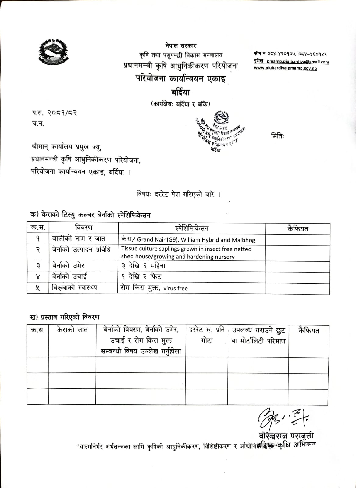 | 8 | केराको टिस्युकल्चर विरुवाको दररेट पेश गर्ने सम्बन्धि फारम । | फारमहरू | 2082-04-11 | हेर्नुहोस् | Download |